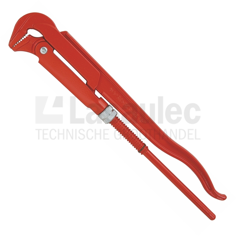 Zweeds model hoekpijptang vervaardigd uit chroom vanadium, voorzien van rode poedercoating. Uitvoering volgens DIN5234, traploos verstelbaar met een tegen de draairichting ingezette vertanding.